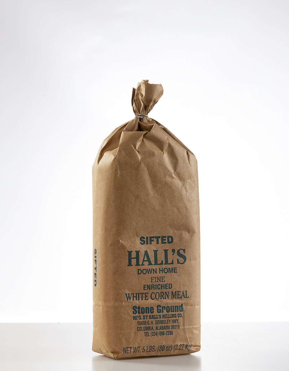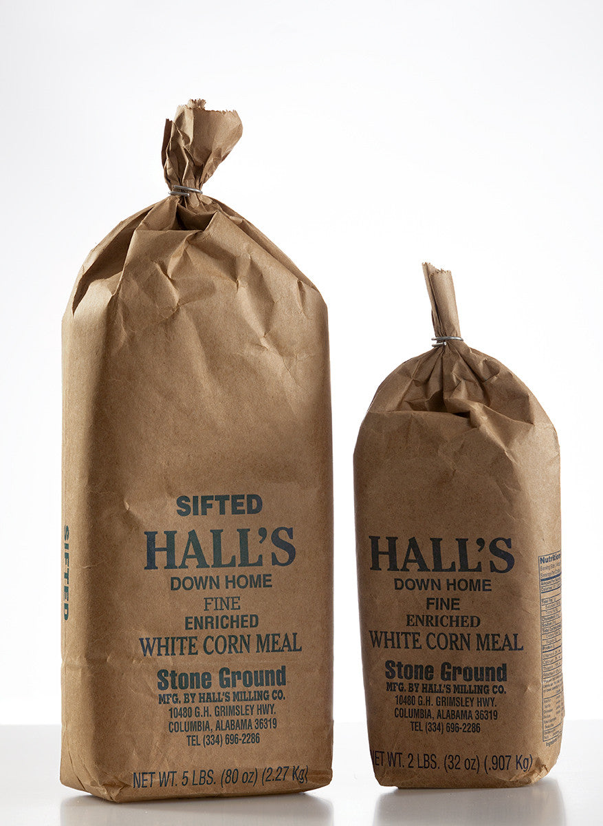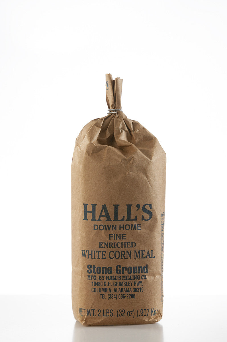 Hall's cornmeal is stone ground from whole grain, white corn. Our fine cornmeal has a slightly courser texture that is created by adjusting the mill stone during the grinding process. All of our cornmeal is great for preparing cornbread, but we also like to use the fine textured cornmeal for making a delicious pizza crust.